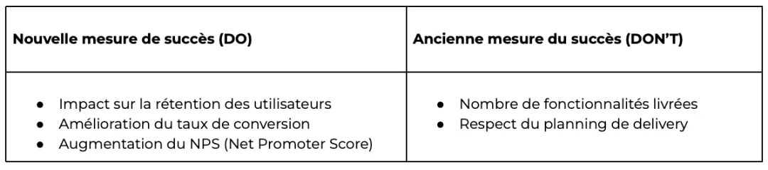 Si l’unique indicateur de réussite est la mise en production d’une nouvelle fonctionnalité, sans suivi de son adoption ou de son impact, il y a un problème. Un produit doit être piloté par des métriques comme l’activation, la rétention, la satisfaction des utilisateurs... pas par le nombre de releases.